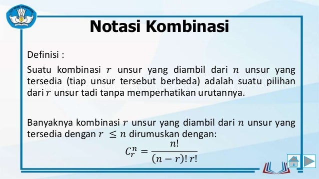 Jika terdapat nperistiwa yang saling lepas untuk memudahkan dalam mengingat manakah yang memperhatikan urutan dan mana yang tidak, yaitu diantara kata permutasi dan kombinasi manakah yang menggunakan huruf u (huruf u mewakili. Kombinasi 2 elemen dari 3 huruf a,b,c adalah ab, ac, bc. Kaidah pencacahan yang akan dipelajari pada modul ini antara lain aturan penjumlahan, aturan perkalian, permutasi, dan kombinasi. Metode aturan pengisian tempat (filling slots), metode permutasi dan metode kombinasi. Sedangkan ba, ca, cb tidak termasuk hitungan karena pada kombinasi ab. Aturan pengisian tempat, permutasi, dan kombinasi. Adapun beberapa metode pada kaidah pencacahan antara lain yaitu: Permutasi berulang adalah permutasi yang dalam penyusunannya urutan diperhatikan dan suatu objek dapat dipilih lebih dari sekali (berulang). Sekian ulasan tentang materi kaidah pencacahan yang meliputi materi aturan pengisian tempat, permutasi, dan kombinasi untuk level kognitif penalaran. Metode aturan pengisian tempat (filling slots), metode permutasi serta metode kombinasi. Mendeskripsikan kaidah pencacahan, permutasi dan kombinasi. Dengan m bilangan asli, dibaca m faktorial digunakan. Peluang kaidah pencacahan, faktorial, permutasi dan kombinasi.