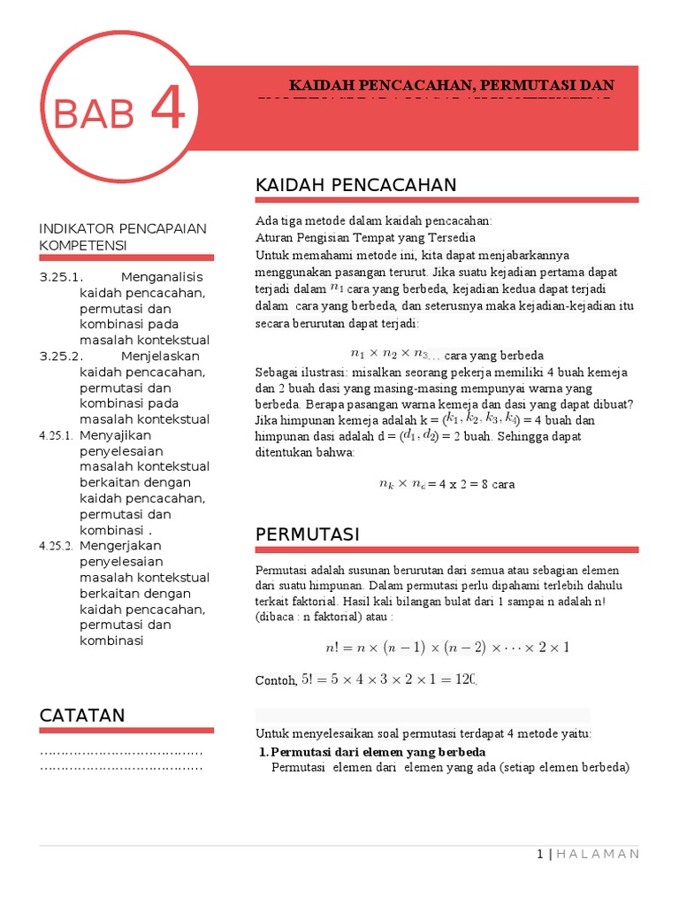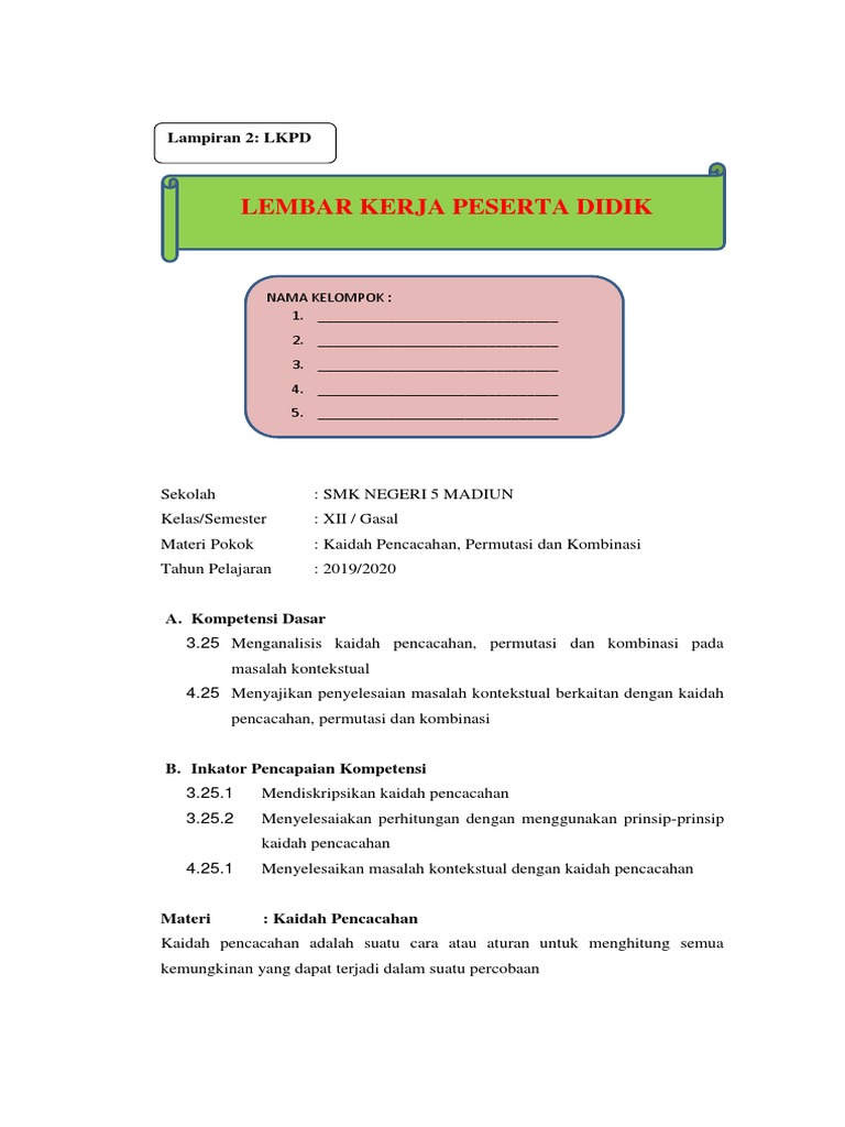 untuk "Kaidah Pencacahan Permutasi Dan Kombinasi : Lkpd Pelatihan E Guru Worksheet / Kaidah pencacahan (counting rules) merupakan sebuah cara atau aturan untuk menghitung seluruh kemungkinan yang bisa terjadi dalam suatu percobaan tertentu."