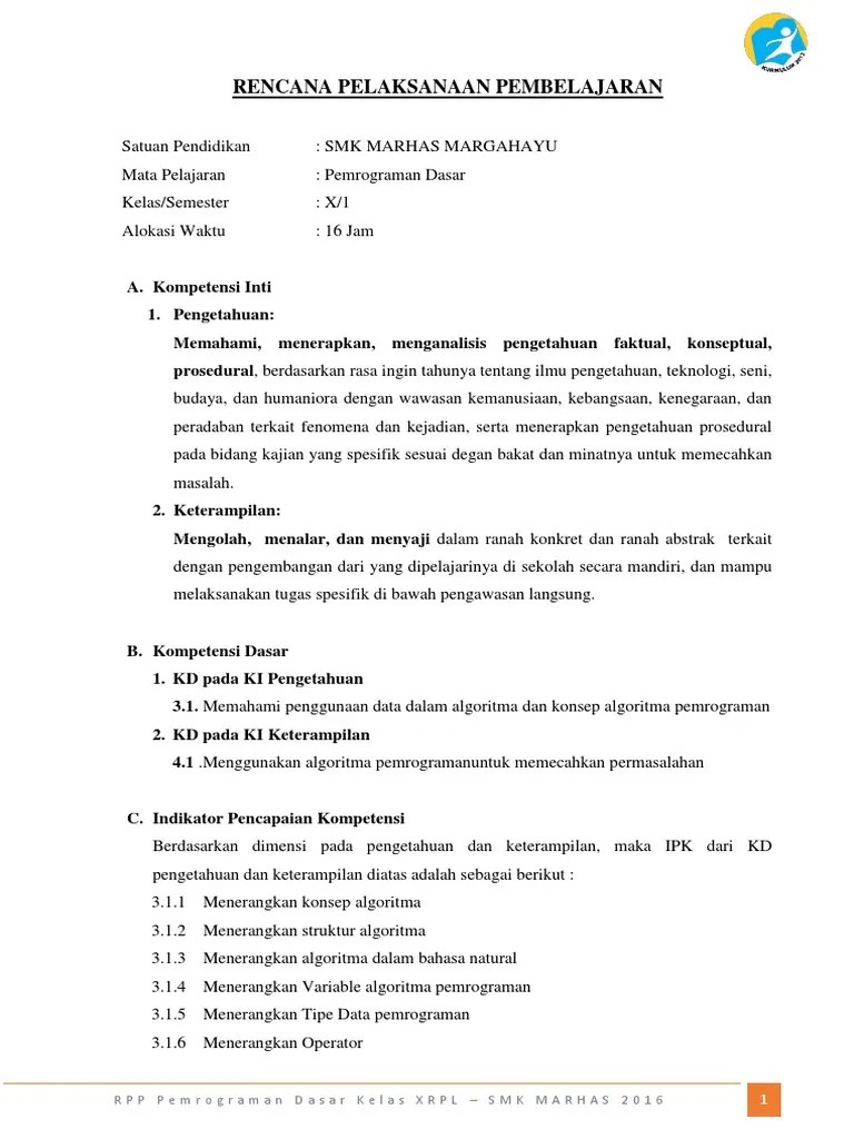 Silahkan download dalam bentuk docx yang siap pakai. Silahkan yang ingin download rpp mata pelajaran pemrograman dasar kurikulum 2013 revisi 2017 smk kelas x semester 1 dan 2, dapatkan edisi lengkap terbaru . Pemrograman dasar kompetensi keahlian : Memahami, menerapkan, menganalisis, dan mengevaluasi . Rpp mata pelajaran pemrograman dasar kelas x smk teknik komputer dan jaringan dimana kompetensi dasar yang digunakan adalah kompetensi dasar struktur .